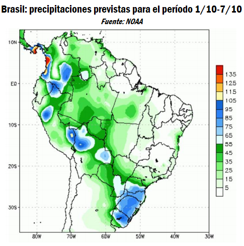 En la zona centro-oeste del vasto territorio brasileño, la oleaginosa podría implantarse en la ventana óptima de siembra, aunque la concreción de las tareas está sujeta a la ocurrencia de próxima precipitaciones. Los pronósticos meteorológicos prevén lluvias irregulares a principios de octubre. En las últimas dos semanas, las sembradoras avanzaron sobre el oeste de Santa Catarina y Rio Grande do Sul. Además, las tareas de siembra avanzaron en los estados de Rondonia en el norte y Mato Grosso do Sul en el centro oeste, y en aquellos campos asistidos con riego artificial en Sao Paulo y Minas Gerais al sureste.