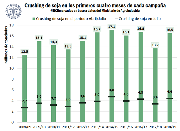 En el mes de julio, el volumen de poroto de soja industrializado por las fábricas del sector totalizó 4,4 millones de toneladas, convirtiéndose en el mejor mes de julio desde 2015. Con una clara recuperación del crushing respecto de la atípica campaña pasada, esta campaña la industria lleva procesadas 16,5 Mt, casi 3 Mt más que el año pasado a igual fecha. De esta forma, el volumen de crushing logrado en los primeros cuatro meses de campaña 2019/20 se ubica medio millón de toneladas por encima del promedio de las últimas 5 campañas. La marca alcanzada en julio, por su parte, se corona como la segunda mejor de la historia.
