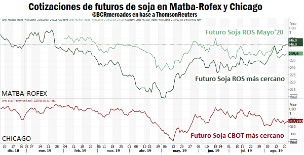 En el mercado de exportación, en tanto, la continuidad de las fricciones entre EEUU y China impulsó al alza las primas del poroto sudamericano, suba que se replicó en el mercado local. Así el futuro con vencimiento más cercano de MATBA-ROFEX logró un máximo de 7 meses esta semana a US$ 246/t, valor que no alcanzaba desde el 24 de enero. De esta forma, acumula un aumento mensual del 6%, impulsado por la suba de las primas FOB para la soja argentina. En contraste, la cotización del futuro más corto en Chicago mostró volatilidad durante el mes de agosto y si se compara su cotización actual con el valor de inicios de mes se observa una suba de sólo el 1%. El jueves 22 de agosto el contrato de soja Septiembre ajustó a US$ 314,53/t.