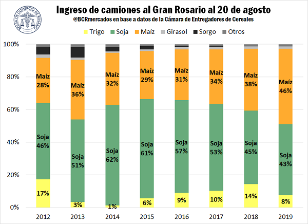 En 2019, el 46% de los camiones ingresados a los puertos del Gran Rosario descargó maíz, el 43% soja y el 8% trigo. De esta manera, las descargas de camiones con maíz en las terminales de la región superan al ingreso de soja en camión. Los datos confirman la tendencia que se vislumbra en las últimas campañas: el volumen de maíz ingresado a las plantas y puertos del Gran Rosario aumenta mientras que la descarga de camiones de soja disminuye. En 2014, 6 de cada 10 camiones ingresados a las plantas contenía soja, y sólo 3 de 10 cargaban maíz. En 2019 casi 5 de cada 10 camiones que descargan granos en el Gran Rosario portan maíz, y 4 de 10 soja. De esta forma, en cinco años los ingresos de maíz pasaron de tener la mitad de la participación porcentual de la soja en el total a superar la participación de la oleaginosa.