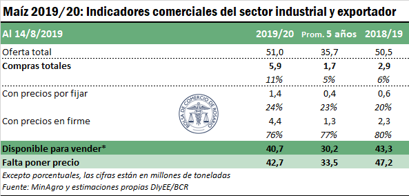 Respecto de la campaña nueva de maíz, que está pronta a sembrarse en Argentina, la exportación y la industria llevan adquiridas 5,9 millones de toneladas. De materializarse la proyección a cosecha de 51 Mt para la campaña 2019/20, el volumen negociado representa el 11% de la campaña, la segunda proporción más alta en 20 años. El único antecedente superador del porcentaje actual se dio en la comercialización temprana de la campaña 2012/13. En aquel año las compras adelantadas cobraron mayor proporción (13%) ya que a esa altura del año aún no se sabía que la producción de maíz resultaría diezmada por la sequía, obteniéndose apenas 27,9 Mt. El escenario actual es sustancialmente diferente, ya que la mercadería negociada sería el 11% de un volumen de producción récord en la próxima campaña. Naturalmente, en valor absoluto, las 5,9 Mt compradas por industria y exportación alcanzan actualmente el nivel más alto en registros de 32 años.