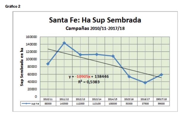 En la provincia de Santa Fe para la misma serie de campañas observamos que la tendencia también es descendente y anualmente en promedio es de – 10.905 ha. (Gráfico N° 2). Considerándola respecto a la superficie media de la serie representa un 12,20%, indicando que la tendencia respecto a la nacional tiene una pendiente mayor (o lo que es lo mismo disminuyó a mayor velocidad)