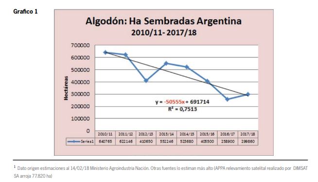A nivel nacional el cultivo del algodón en los últimos años (2010/11 a 2017/18) está en manifiesta disminución, según inferimos de la información disponible y que apreciamos en el gráfico N° 1:
