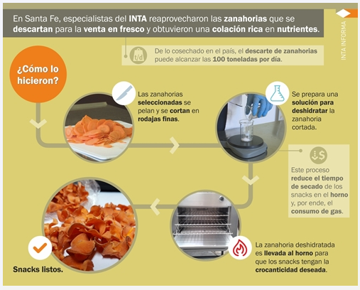 En las cercanías de la capital santafesina, técnicos de la agencia de extensión del INTA en Monte Vera lograron convertir el descarte productivo de zanahoria –que suele alcanzar las 100 toneladas por día en la zona– en snacks saludables, nutritivos y sin gluten, condición que los vuelve aptos para celíacos. Además, trabajan en acuerdos con empresas alimenticias para que la colación pueda ser producida a escala y llegue a las góndolas.