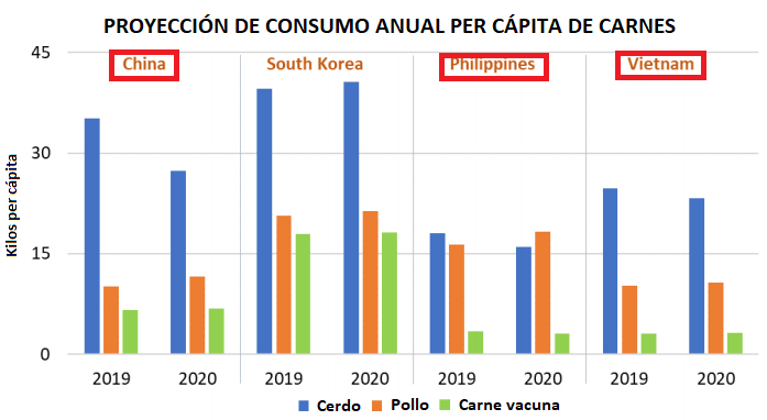 Poniendo a China como ejemplo, vemos que no hay una proporcionalidad entre el recorte productivo y del consumo de un tipo de carne, la porcina en este caso, y un aumento productivo y de consumo de otra sustituta, como la aviar.