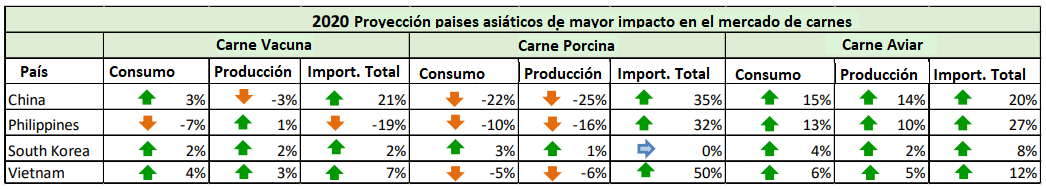 En el siguiente cuadro vemos la proyección 2020 para el consumo, producción e importaciones de estos países tan importantes en el ranking del mercado de las carnes.