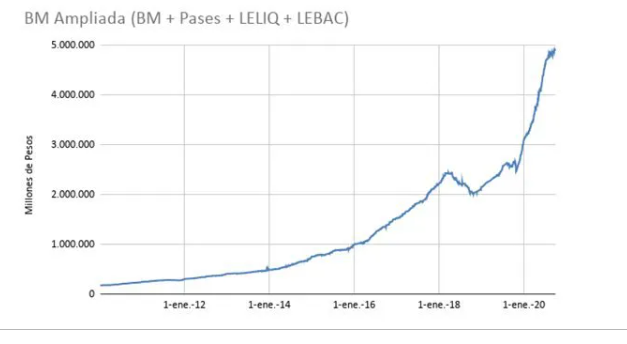 En pocas palabras, la Base Monetaria ampliada está hoy en casi 5 billones de pesos (5 millones de millones).
