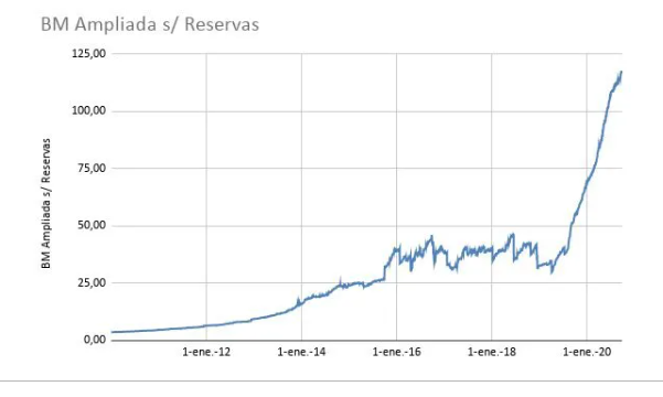 Esta es la relación entre Base Monetaria Ampliada y las Reservas (calculando el ratio entre una y otra).