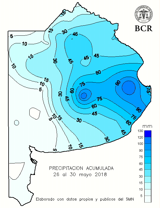 Tras cinco meses de una sequía feroz, que fue catalogada como la peor de los últimos 50 años (https://bit.ly/2kUuJQ0), hubo un cambio total en las condiciones atmosféricas. El fenómeno comenzó en abril, cuando una persistente masa de aire tropical envolvió a la región pampeana. El ambiente de alta hu-medad pronto desembocó en frecuentes lluvias y lloviznas, que no tardaron en pasar a ser una notable anomalía positiva de lluvias. El agua dejó registros de 250 a 300 mm en su mayor bastión de operaciones, el noreste de Buenos Aires. Pero los totales del mes alcanzaron a gran parte del este de la franja occidental del país. El este cordobés alcanzó valores de 150 a 170 mm. Como ejemplo vale el caso de Monte Buey con 159 mm acumulados en el mes, o Noetinger e Idiazábal con 140mm.