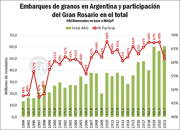 En este contexto, y a pesar de las dificultades que impuso el nivel del Río Paraná y el revés productivo que sufrieron algunos de los principales cultivos durante la última campaña, el país despachó, desde todas sus terminales portuarias, granos por 60,66 Mt en el 2021, un 7% más que todo lo embarcado en 2020 y alcanzando un récord histórico al superar la marca del 2019 (en aquel entonces se despacharon 60,3 Mt).