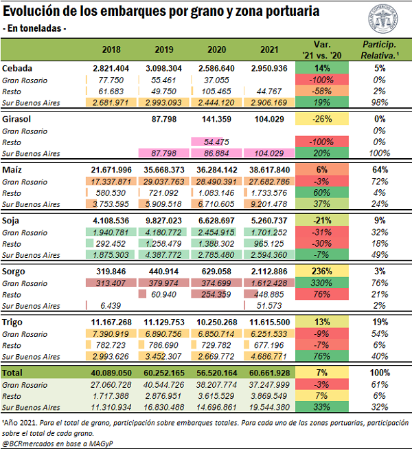 En primer lugar, uno de los elementos que se destaca es lo ocurrido con el trigo. Si bien los despachos del cereal de invierno se incrementaron un 13% interanual durante el 2021, los puertos del Gran Rosario embarcaron un 9% menos mientras que las terminales del sur de Buenos Aires incrementaron un 76% respecto de 2020. Esto se debe a que el trigo 2020/21 sufrió un revés productivo en las regiones del centro y norte del país, que son precisamente las zonas que, por su cercanía geográfica, tienen a las terminales portuarias del Up-River como principal vía de salida de su producción. Paralelamente, la producción en la región sur, que se embarca para exportar en los puertos del sur bonaerense, resultó considerablemente abultada en términos históricos. De esta manera, la mayor disponibilidad de granos en esas zonas hizo crecer los embarques desde Bahía Blanca y Necochea/Quequén.