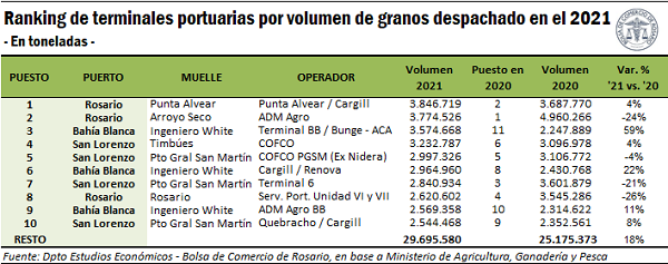 Tornando la atención a las terminales portuarias que mayor volumen de granos despacharon en 2021, las dos que más cantidad de granos embarcaron fueron terminales ubicadas en Rosario: el muelle de Punta Alvear que opera Cargill con 3,85 Mt y el muelle de Arroyo Seco que opera ADM con 3,77 Mt. Además, estas dos terminales intercambiaron su posición en el ranking del año previo. En tercer lugar se ubicó la Terminal Bahía Blanca operada por Bunge/ACA, que incrementó un 59% sus despachos en 2021 y escaló desde la 11va posición alcanzada el año anterior.