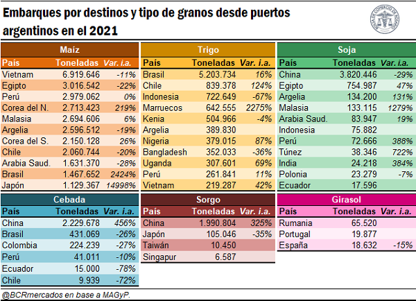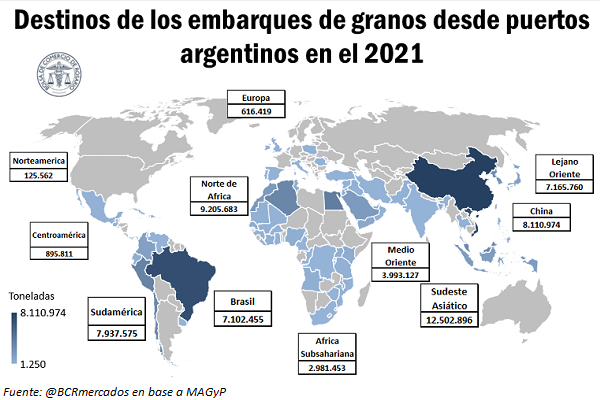 El Norte de África se ubicó segundo con 9,2 Mt (↓3% i.a.) de la mano de los embarques hacia Egipto (3,8 Mt), Argelia (3,1 Mt) y Marruecos (1,7 Mt). En tercer lugar se posicionó China, que recibió 8,1 Mt (↑28% vs. 2020). Luego siguió Sudamérica (sin contar Brasil) con 7,9 Mt (↑6% i.a.) en cuarto lugar. Aquí se destacan los despachos hacia Perú (3,4 Mt) y Chile (2,9 Mt). El Lejano Oriente con 7,2 Mt (↑108% vs. 2020) quedó en quinto lugar con Corea del Norte recibiendo 2,7 Mt, Corea del Sur 2,1 Mt y Japón 1,2 Mt. Por último, el sexto de los principales destinos fue Brasil con 7,1 Mt (↑39% i.a.).