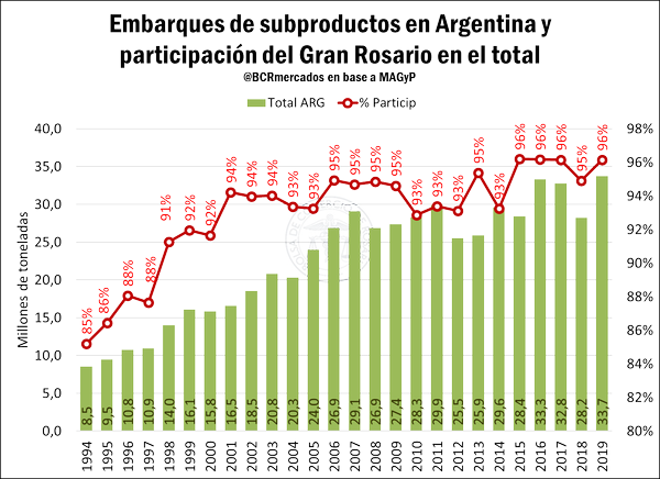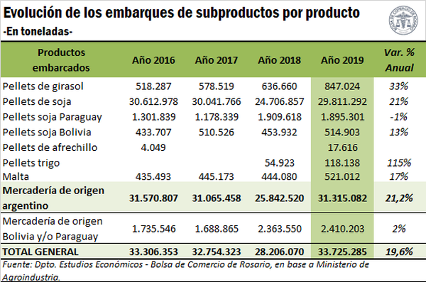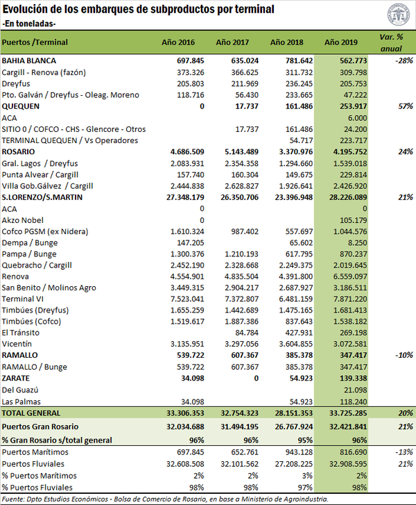 En el año 2019, los despachos de subproductos al exterior, provenientes de todas las terminales portuarias de la República Argentina, alcanzaron un volumen de 33,7 millones de toneladas, lo que constituye un récord histórico. Respecto del año 2018, el aumento fue de 5.573.932 toneladas, es decir un 20% más.