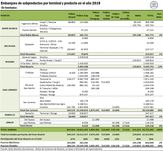 En 2019 se embarcaron 31,3 millones de toneladas de harinas proteicas y pellets de origen argentino, presentando una recuperación del 21% respecto al año previo, signado por la sequía. De los despachos nacionales de subproductos, el 95,2% fueron pellets de soja (29,8 Mt); el 2,7% pellets de girasol (847 mil t); el 1,7% malta (521 mil t); el 0,4% pellets de trigo (118 mil t); y, por último, el 0,1% restante pellets de afrechillo (18 mil t).