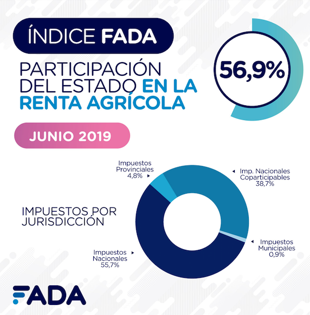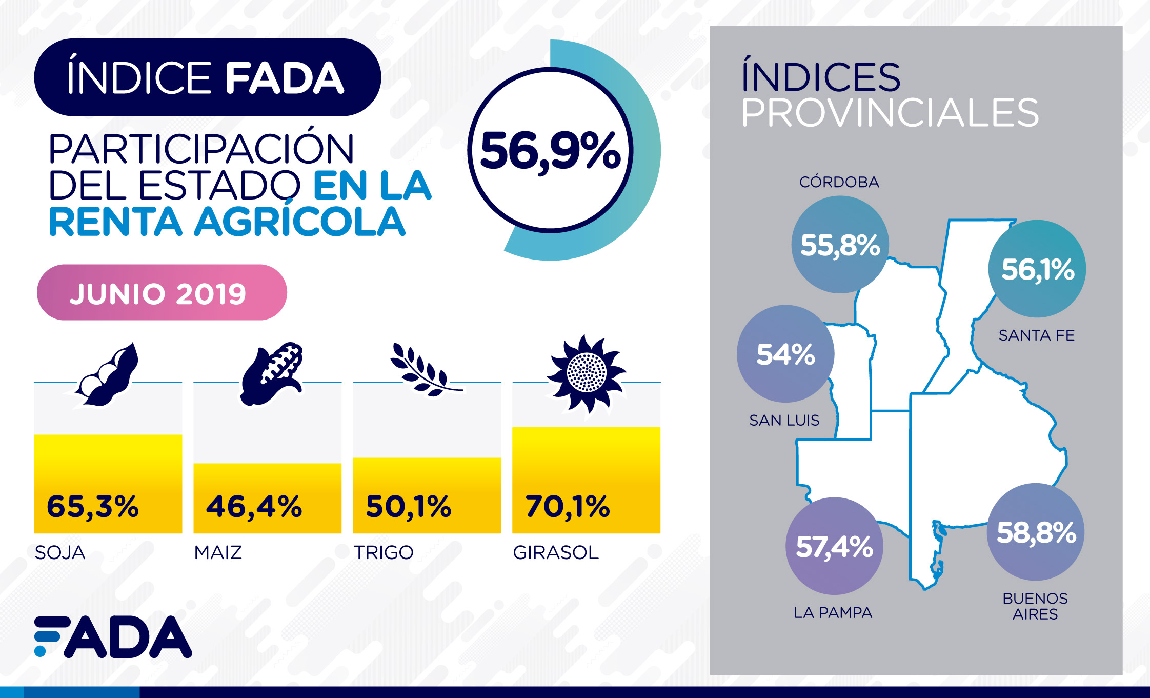 La medición de junio 2019 reveló que el 56,9% de la renta es retenida por los distintos niveles estatales. Dicho de otro modo, de cada $100, $56,9 son para los gobiernos, ya sea municipal, provincial o nacional. Mientras que el promedio ponderado de cultivos a nivel nacional es de 56,9%, la participación del Estado en soja es del 65,3%, en maíz 46,4%, en trigo 50,1% y en girasol 70,1%.