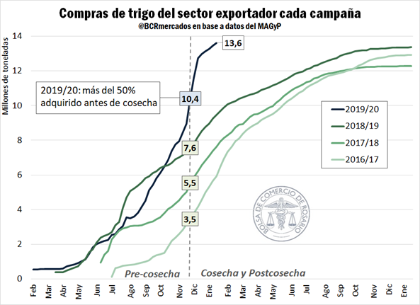El año comercial 2019/20 se inició en diciembre y a esa altura la exportación ya había adquirido 10,4 millones de toneladas, es decir el 52% de la cosecha estimada. A igual momento en ciclos anteriores las compras de exportadores eran del 40% de la cosecha(2018/19), 30% (2017/18) y 20% (2016/17). En diciembre, primer mes del año comercial, la actividad se intensificó y según datos del Ministerio de Agricultura, Ganadería y Pesca (MAGyP) las compras al 15 de enero totalizan 13,6 Mt.
