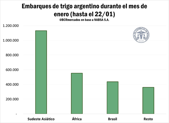 En contrapartida, los embarques de trigo desde las terminales del Gran Rosario al 22 de enero alcanzan 1,5 Mt en lo que va del corriente mes. En tanto, de acuerdo a la información de embarques de la agencia marítima Nabsa S.A., el 46% de los buques que partieron con trigo desde todos los puertos argentinos en lo que va de enero se dirigían al sudeste de Asia, cargando en total 1,1 millones de toneladas del cereal.