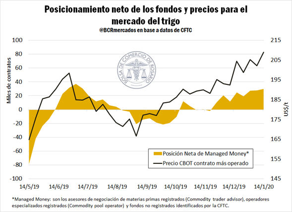 En los primeros 15 días de enero los fondos de inversión compraron casi 320.000 toneladas de trigo en contratos CBOT, consolidando una posición comprada de 3,8 Mt. El día jueves 23/01 el contrato de trigo con mayor volumen operado (trigo blando rojo de invierno con entrega en Marzo’20) ajustó a US$ 213,3/t, unos 11,2 dólares por encima del cierre a finales de diciembre (202,1/t) y 18,2 dólares por encima de la cotización al final de noviembre (US$ 195,1/t).