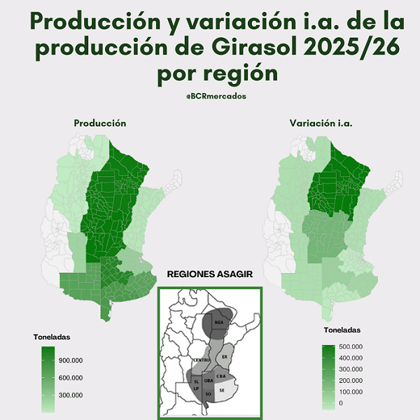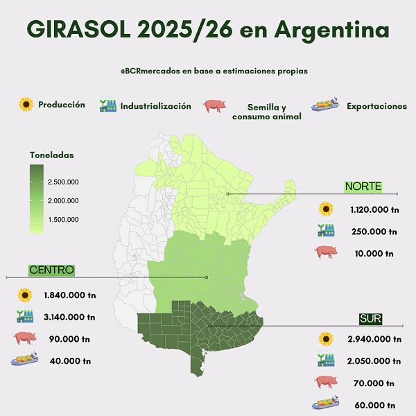 Desde el punto de vista regional, la Región Sur tendrá un superávit de 760.000 toneladas, que abastecerá principalmente a la Región Centro, donde se concentra la mayor capacidad de industrialización del país. Allí, con una producción de 1,84 millones de toneladas, se proyecta un crush de 3,14 millones, generando un déficit regional de 1,43 millones de toneladas que será cubierto con girasol proveniente del sur y del norte argentino.