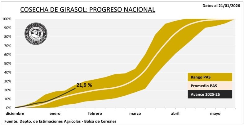 La cosecha de girasol comienza a ganar ritmo en el mapa agrícola argentino. Con un avance del 21,9 % del área apta, la recolección mostró un salto intersemanal de 5,6 puntos porcentuales y se ubica 12 puntos por encima del promedio de las últimas cinco campañas, un indicador claro de la dinámica que está mostrando la actual temporada.
