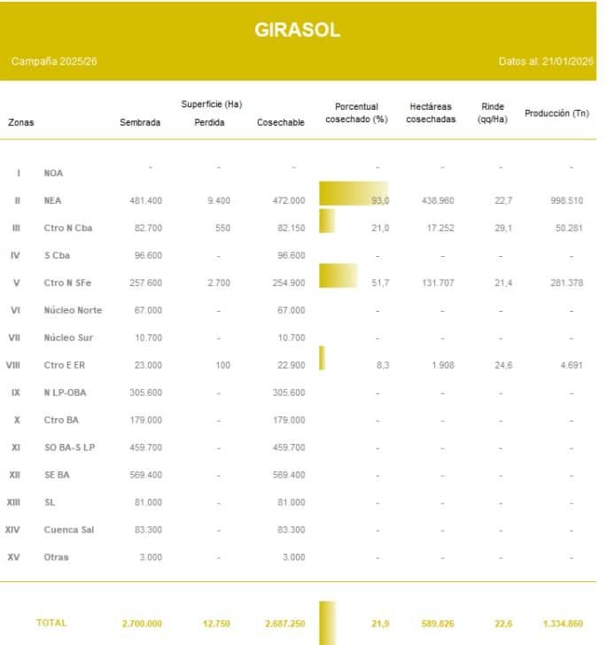 Con casi el 22 % del área ya recolectada y un fuerte adelanto frente al promedio de los últimos años, el girasol muestra números alentadores. Los rindes se mantienen altos en todo el país y el NEA está a punto de cerrar una campaña récord.