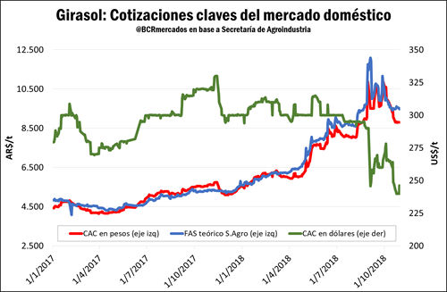 En relación a los precios, si bien el complejo girasol venía mostrando un extraordinario pulso alcista hasta comienzos de septiembre, desde entonces y de la mano de la volatilidad cambiaria la tendencia se ha revertido. En la última semana, sin embargo, los valores del girasol se recuperaron y el precio de referencia de la Cámara Arbitral de Cereales de Rosario alcanzó el jueves los $9.200, que representan una variación de 4,5% respecto de la semana anterior. En dólares, el aumento semanal fue del 5%, cerrando el jueves a US$ 260,6.