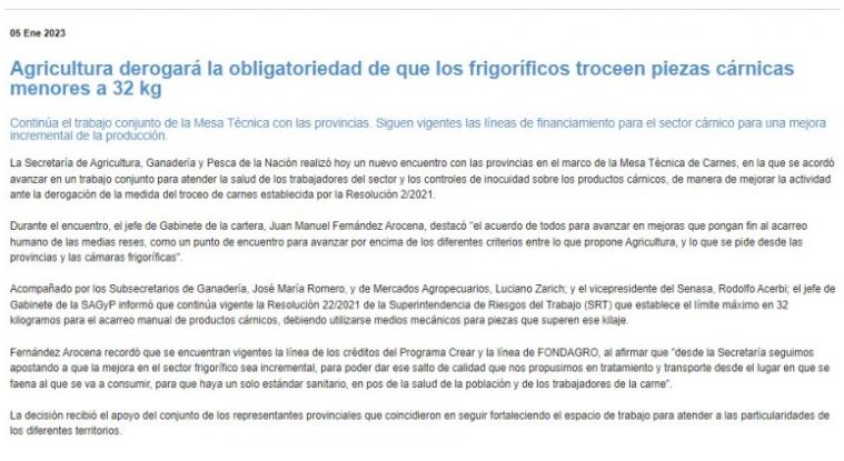 En una sorpresiva reunión que mantuvo este miércoles con las provincias, la Secretaría de Agricultura, Ganadería y Pesca de la Nación dio marcha atrás con lo informado hace menos de una semana, el 5 de enero, cuando, en un comunicado de prensa, manifestó que “Agricultura derogará la obligatoriedad de que los frigoríficos troceen piezas cárnicas menores a 32 kg”.