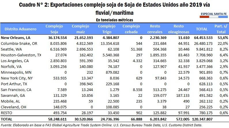 Las canales de exportación por agua de granos, oleaginosas y subproductos en Estados Unidos se pueden dividir en dos vías principales. Una es la salida de los graneles por los puertos del pacífico, siendo su destino principal los países del sudeste asiático (incluidos Japón y China). La otra salida sigue la desembocadura del río Mississippi en el Golfo de México. Según cita el AMS (Agricultural Marketing Service, organismo dependiente del United States Departament of Agriculture, USDA) en sus reportes de logística de granos, la cuenca del Mississippi es la arteria principal del sistema de comercio granario estadounidense exportando competitivamente maíz, trigo, soja y subproductos. Sin embargo, no debe perderse de vista que existen otras regiones portuarias de relevancia en los Estados Unidos que embarcan granos y oleaginosas. En el total de las cargas, juegan un papel importante la exportación de graneles desde los puertos situados en la región de los Grandes Lagos, los puertos sobre el Atlántico y los envíos vía ferrocarril a México (que no se encuentran en la lista por ser exportaciones por medios terrestres).