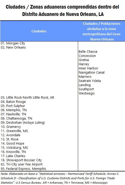 Los valores de exportación cereales, oleaginosos y subproductos se obtuvieron procesando los datos de la API (web service) del Departamento de Comercio de Estados Unidos, dependiente de la Oficina de Censo de los Estados Unidos. La clasificación de las áreas aduaneras está bajo la supervisión de la Oficina de Estadísticas de Comercio Exterior de EE.UU. Los puertos comprendidos en el área aduanera se encuentran en la siguiente tabla: