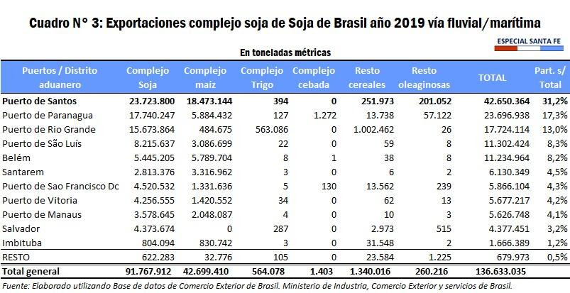 A raíz de los datos expuestos en el cuadro N° 3 se puede apreciar que gran parte del complejo soja y del complejo maíz se exporta a través de los puertos localizados en el sureste del país (Santos, Paranaguá, Rio Grande, San Francisco Do Sul, Vitoria) contabilizando el 61 % del total de soja y subproductos embarcados por el país y el mismo valor para el maíz. Entre los tres primeros hay una buena repartición en los volúmenes despachados. El puerto de Santos, es el más importante de América Latina por volumen comercial (considerando todos los bienes de carga y descarga). Tiene 5 terminales de contenedores, 12 de carga general, 24 de graneles líquidos, 14 de graneles sólidos, 2 terminales de embarque automotriz y una de pasajeros. Posee una participación aproximada de 29 % en la balanza comercial brasilera, siendo sus productos principales exportados los del complejo soja, azúcar, jugo de naranja, maíz y pasta química de madera. De la misma manera que la zona portuaria de Nueva Orleans, en el Puerto de Santos confluyen todos los modos de transporte disponibles (barcazas provenientes de la Hidrovía Tieté-Paraná que hacen su transbordo en Pederneiras, ferrocarriles, ductos y camiones por diversas carreteras). En 2019 fueron despachadas a través del puerto de Santos, 23,72 Mt de productos comprendidos en el complejo soja, 18,47 Mt de grano de maíz. El total de graneles exportados ascendió a 42,65 Mt generando una participación del 31 % en el total de las cargas embarcadas en 2019 por Brasil.