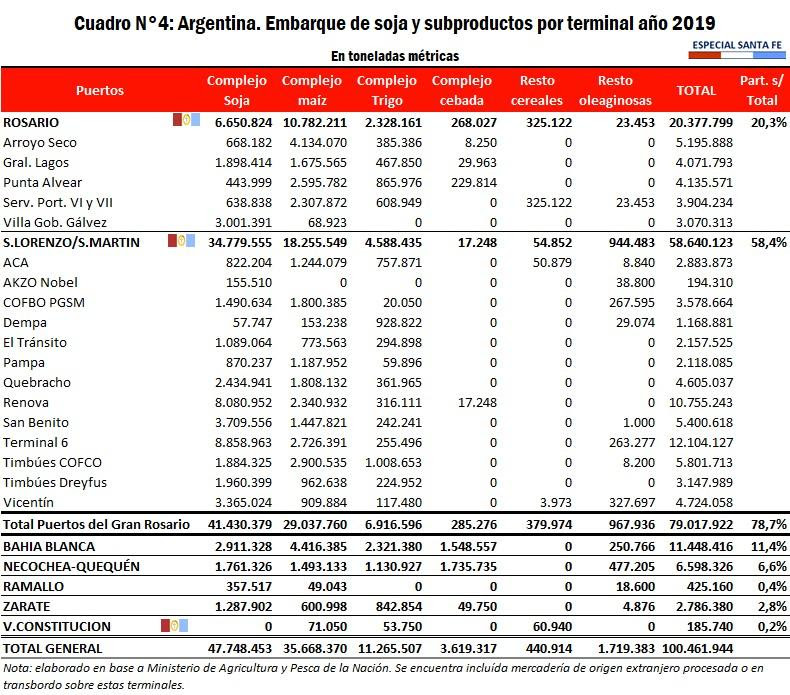 En el informativo semanal N° 1.939 de la Bolsa en un estudio formulado por Alfredo Sesé y Pablo Ybañez se había comunicado que a los puertos del Gran Rosario habían ingresado 2.632 buques oceánicos en el 2019, alcanzando la cifra más alta desde que se lleva registro en los últimos 20 años. Para el año 2019, el Gran Rosario embarcó 41,43 Mt de toneladas de poroto y subproductos de soja, (87 % del total embarcado por Argentina), 29 Mt de toneladas de maíz en grano (81 % del total) y 6,9 Mt de toneladas de harina y grano de trigo (61 % de los despachos de Argentina). El total bruto asciende a 79 Mt despachado en el año 2019. Este total no contabiliza despachos de Biodiesel.