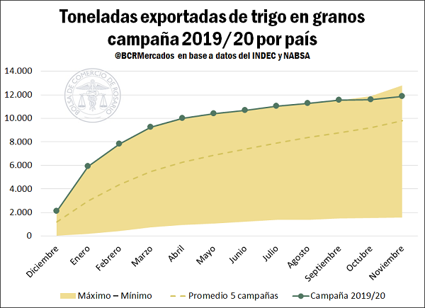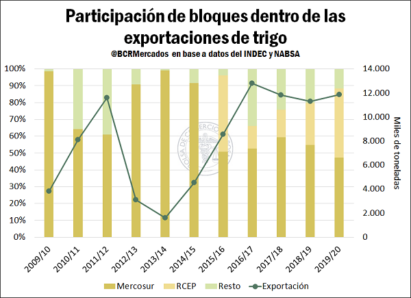 Brasil ha sido el destino a lo largo de las últimas 10 campañas de no menos del 74% de las exportaciones de trigo de Argentina al MERCOSUR, esto refleja la importancia estratégica de este mercado para las ventas externas trigueras argentinas. Aún más, en el promedio de las campañas entre 2009/10 y 2019/20, esta participación se amplía hasta alcanzar al 84,6% de las exportaciones del bloque económico.