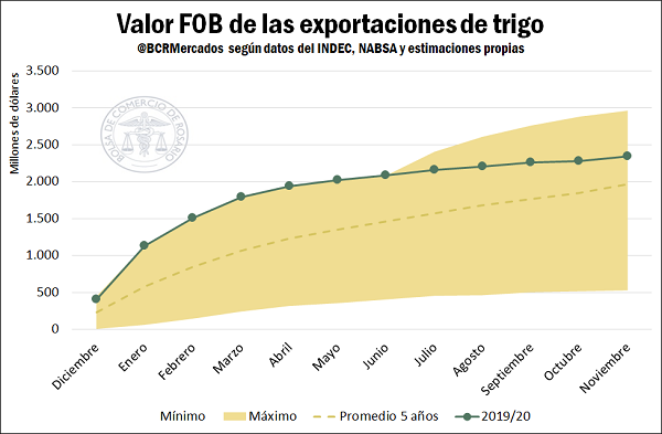 El volumen exportado de trigo en campaña 2019/20 alcanzó 11,9 millones de toneladas, igualando el tonelaje logrado en 2017/18 y logrando así la segunda mejor marca desde que se tiene registro, sólo superada por la campaña 2016/17 (12,8 Mt). A pesar de la excelente performance exportadora en términos de volumen, el desempeño de la campaña 2019/20 en términos de valor exportado fue menor. La campaña pasada se ubica en el quinto puesto entre los ciclos con mayores ingresos FOB desde 2009/10. Esto se debe particularmente a los menores valores de los commodities durante los primeros meses del año comercial 2019/20, cuando se realizara la mayor parte de las ventas externas de trigo. Al mismo tiempo, como consecuencia de una mayor comercialización al inicio de la campaña no fue posible aprovechar en su totalidad la revalorización que tuvo el cereal en el último tramo del año. Sin embargo, cabe destacar que a pesar de ubicarse quinta respecto del ingreso de divisas entre las últimas campañas, el valor final provisorio originado por el trigo 2019/20 (US$ 2.343 millones) se encuentra sólo un 21% por debajo del máximo histórico (US$ 2.960 millones en 2011/12), mientras que supera en un 19% al promedio del valor FOB de las 5 campañas previas.