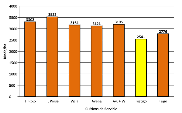 Gráfico 1. Rendimiento de la soja de primera en kg/ha sembrada el 18 de noviembre según antecesor. Ciclo 2018/19. Establecimiento Las Aromas (Ayacucho). El antecesor de los cultivos de servicio es girasol. Segundo año consecutivo de implementación del módulo, actualmente sembrado con trigo.