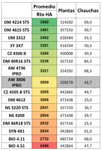 En la experimentación de comparación de variedades, las más destacadas en el sitio de evaluación (Ayacucho) fueron DM 4214 STS, DM 4615 STS, DM 3312 y SY 3×7, seguidas por CZ 4306 B, DM 40R16 STS y AW 4736 Ipro (Cuadro 1).