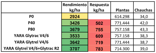 Cuadro 2. Rendimientos en soja de primera según fertilización. Fósforo (P) con 40 y 80 kg/ha. Glytarc: 360 gramo/litro óxido de Calcio + 50 gramo/litro Boro + 100 gramo/litro Zinc. Grytrel: 93 gramo/litro óxido de fósforo + 93 gramo/litro Magnesio.