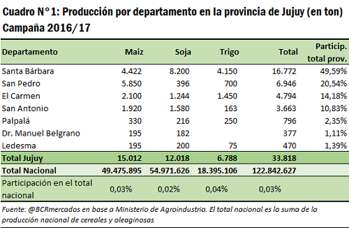 Jujuy, la más pequeña de las provincias bajo análisis y con una parte muy limitada de tierras aptas para la actividad agrícola, produjo alrededor de 34 mil toneladas en la campaña 2016/2017, un volumen mucho menor al del ciclo 2011/2012 (5 años atrás), en donde en promedio se cosecharon cerca de 52 mil toneladas. Esta información consta en los cuadros N° 1 y 2. Esta baja en la campaña 2016/2017 se debió a mayores pérdidas por superficie sembrada que no se cultivó y por caídas en los rindes. La producción jujeña, como puede verse en los mapas correspondientes, se concentra principalmente en el sur de la provincia, en los departamentos de Santa Bárbara y San Pedro. Ambos limitan con el departamento salteño de Anta, el de mayor producción granaria de la provincia de Salta. Santa Bárbara y San Pedro concentran casi el 70% de la producción agregada de maíz, soja y trigo de la provincia de Jujuy: cerca de 23.000 tn en la campaña 2016/2017.