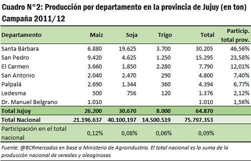 Resulta de interés analizar la producción proveniente de Jujuy en una campaña no afectada por pérdidas, para de esta manera tener una mejor perspectiva del potencial de la provincia. Para ello hemos tomado como referencia la campaña 2011/12, la mejor entre las 5 previas a la 2016/2017. En aquella temporada, se produjeron cerca de 65 mil toneladas (soja + maíz+ trigo), de las cuales cerca de 45 mil se cosecharon en los dos departamentos citados anteriormente.