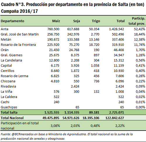 - El departamento de Anta acapara el 53,42% de la producción provincial de los tres principales granos, con 1,4 millones de toneladas. Es el más productivo de dicha provincia en estos tres cultivos.