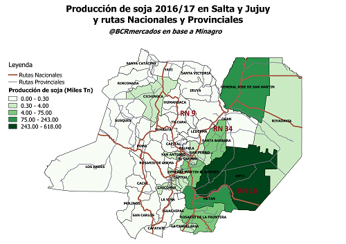 Salta y Jujuy aportaron poco más de 2,7 millones de toneladas entre las producciones de trigo, maíz y soja en la campaña 2016/2017, pero son los departamentos salteños los que contribuyen con el 98% de estas cosechas mientras que el resto lo hacen los jujeños. A los precios vigentes en un mercado terminal como el de Rosario, el aporte de ambas provincias está en el orden de 15.300 millones de pesos. Para su crecimiento hay varias problemáticas por resolver, pero una de las principales es la infraestructura del transporte, particularmente por ser altamente dependiente del transporte terrestre por carretera.
