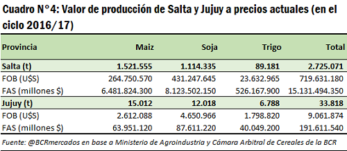 Procedimos a valorizar la producción de soja, maíz y trigo de ambas provincias para tratar de inferir acerca del aporte que generan estos granos en la economía de esas jurisdicciones. Si tomamos la cosecha de la campaña 2016/2017, las casi 2,7 Mt de granos (soja + maíz + trigo) representan a precios FOB de exportación actuales casi 720 millones de U$S para la provincia de Salta y 9 millones para Jujuy. En el caso de la provincia de Salta se trata de una cifra realmente importante.