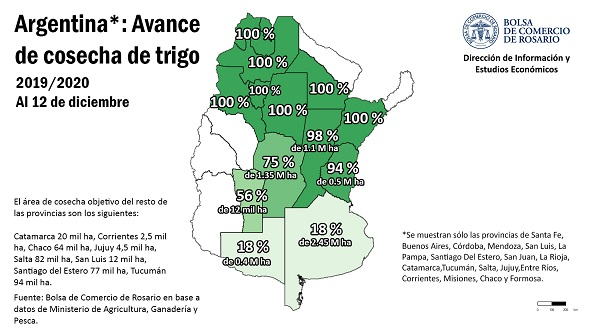 Los mejores rindes a lo esperado que revela el avance de la cosecha de trigo en el territorio nacional, llevó a la Guía Estratégica para el Agro (GEA) de la Bolsa de Comercio de Rosario a incrementar sus estimaciones productivas para la campaña 2019/20 en 0,5 Mt, situándola ahora en el volumen récord de 19,5 Mt en el total del país. Los sorprendentes rendimientos que se están materializando en la provincia de Santa Fe, donde restaría poco por finalizar la cosecha, explican fundamentalmente la suba en el volumen estimado; la provincia estaría consolidando la segunda mejor campaña de los últimos 10 años en rendimiento del cultivo.