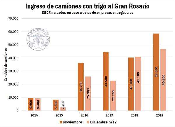 Junto con el buen avance en las tareas de cosecha, la mercadería continúa entrando de forma fluida a los puertos del Gran Rosario. El mes de noviembre resultó récord en ingresos de camiones con trigo a puertos, con un estimado de 58.600 camiones ingresando al área (lo que totalizaría unas 1,64 millones de toneladas), un 45% por encima del año pasado. El mes de diciembre comenzó con la misma intensidad, y también se encuentra por encima de todos los años desde que se lleva registro; a fecha del 12 de diciembre, el total de camiones ingresados al Gran Rosario ronda los 46.800 (1,3 Mt), 14% por encima del 2018 en el mismo período.