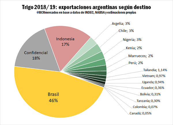 En la campaña 2018/19 Indonesia volvió a llevarse el segundo puesto entre los destinos de exportación para el cereal nacional (dejando de lado las exportaciones a destinos confidenciales), mostrando un importante crecimiento en su participación respecto del ciclo precedente. De hecho, Indonesia fue el país que más incrementó sus compras de trigo argentino en comparación con el ciclo 2017/18. Esta campaña, el país del Sudeste Asiático triplicó sus importaciones, comprando 1,3 Mt más que en 2017/18. De esta forma, Indonesia pasó de absorber el 5% de las exportaciones de trigo argentino a comprar el 17% del total en 2018/19. Otros mercados destacados para el trigo argentino esta campaña fueron Argelia, Chile y Nigeria todos ellos con compras superiores a 300 mil toneladas.