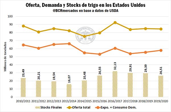 La publicación del informe mensual del Departamento de Agricultura de los Estados Unidos fue interpretada de forma alcista por parte de los operadores en el mercado de Chicago; una hoja de balance más ajustada para el trigo en los Estados Unidos alentó los precios en la jornada del martes. Un aumento en las exportaciones estimadas para el país del norte, junto con un balance de oferta mayormente estable, decantó en una rebaja en la estimación de stocks finales mayor a la esperada. Estos nuevos stocks finales, estimados ahora en 26,5 Mt, resultarían los más bajos de las últimas cuatro campañas.