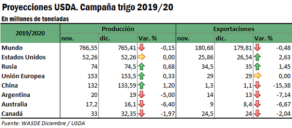 Por otro lado, las estimaciones de producción de trigo para la presente campaña a nivel mundial se han visto prácticamente invariables, con una leve caída del 0,15% en comparación con el informe de noviembre. En este sentido, una menor producción esperada para Argentina (19 Mt), Australia (16,1 Mt) y Canadá (32,35 Mt), es compensada casi en su totalidad por una suba en las estimaciones para Rusia (74,5 Mt), la Unión Europea (153,5 Mt) y China (133,59 Mt).