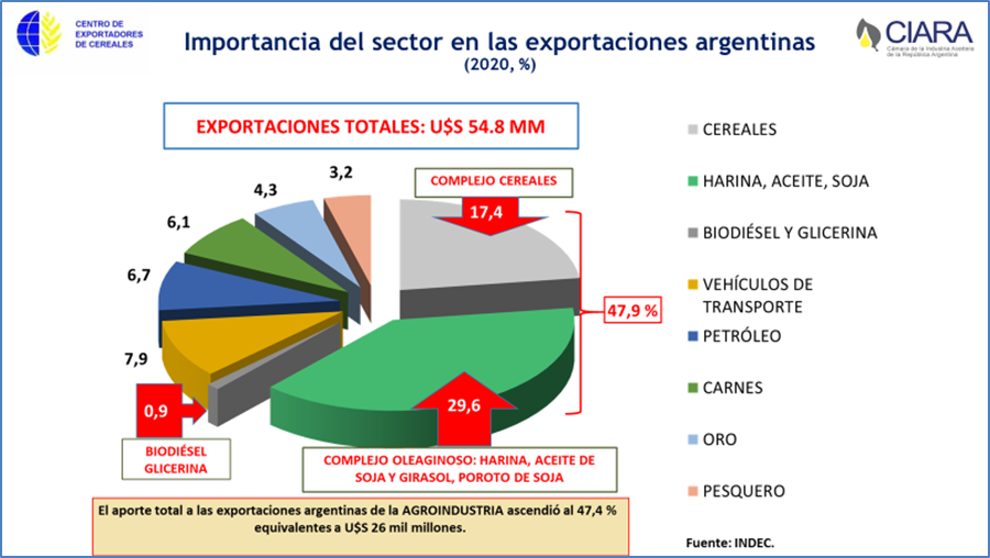El complejo oleaginoso-cerealero, incluyendo al biodiésel y sus derivados, aportó el año pasado el 48 % del total de las exportaciones de la Argentina, según datos del INDEC.
