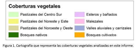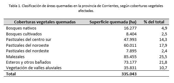 Además, se clasificaron y cuantificaron las áreas quemadas según 8 (ocho) coberturas vegetales afectadas, de la siguiente manera: bosques nativos, bosques cultivados (estas 2 coberturas provista por la Dirección de Recursos Forestales de Corrientes), malezales, pastizales del centro sur, pastizales del noroeste y oeste, pastizales del nordeste, esteros