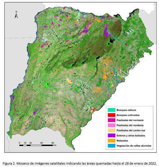Las escasas precipitaciones en los últimos 2 años y las elevadas temperaturas registradas desde fines de 2021 e inicios de 2022, propiciaron las condiciones para la proliferación de incendios, espontáneos o intencionales. La teledetección ofrece herramientas clave para el monitoreo de las áreas quemadas (De Santis y Vaughan, 2009). En un reciente informe se cuantificaron más de 115.000 ha quemadas entre los meses de diciembre 2021 y enero 2022 (Saucedo et al 2022). En este trabajo, se realizaron ajustes de clasificación y se actualiza el área quemada, según la cobertura vegetal afectada.